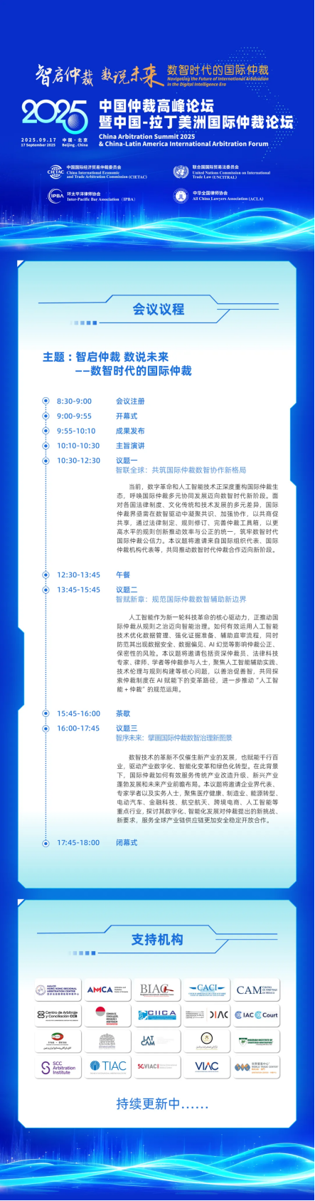 由中國(guó)國(guó)際經(jīng)濟(jì)貿(mào)易仲裁委員會(huì)(CIETAC)、聯(lián)合國(guó)國(guó)際貿(mào)易法委員會(huì)(UNCITRAL)、環(huán)太平洋律師協(xié)會(huì)(IPBA)以及中華全國(guó)律師協(xié)會(huì)(ACLA)聯(lián)合舉辦的2025中國(guó)仲裁高峰論壇暨中國(guó)-拉丁美洲國(guó)際仲裁論壇將于2025年9月17日在北京舉辦。