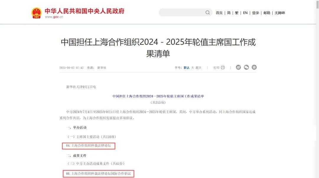 9月1日,上海合作組織成員國元首理事會第二十五次會議在天津順利召開。外交部發(fā)布《中國擔(dān)任上海合作組織2024-2025年輪值主席國工作成果清單》(以下簡稱《成果清單》),中國國際經(jīng)濟(jì)貿(mào)易仲裁委員會(以下簡稱貿(mào)仲)兩項(xiàng)成果收錄其中。由貿(mào)仲主辦的“上合組織仲裁法律論壇”,被列入《成果清單》“主席國主要活動”(第64項(xiàng))。論壇所發(fā)布的《上合組織仲裁法律論壇國際合作倡議》被列入《成果清單》“中方主辦活動成果文件”(第66項(xiàng))。