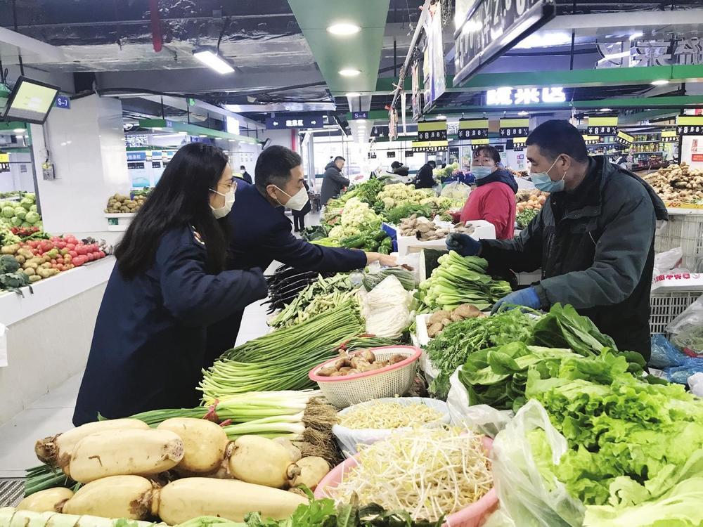 市場監(jiān)管執(zhí)法人員檢查集貿(mào)市場秩序。