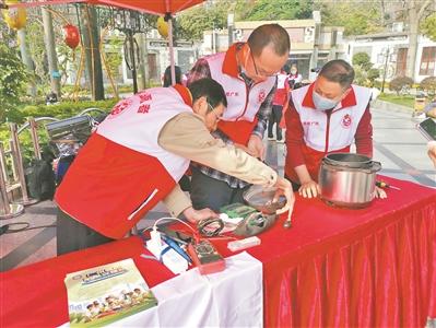 帶上萬能表、螺絲刀、“士巴拿”,拖著工具箱,召集“老”伙伴,出發(fā)!2023年3月15日,一個風和日麗的日子,粵暉家電義修隊在廣東省老干部大學的一片空地上擺開了“家當”,開始了他們的義修活動?,F(xiàn)場外圍,已經(jīng)有拿著待修電器的群眾排起了長隊。長長的工作臺上,各種小家電和工具一一鋪開,隊員們認真細致地檢查小家電的故障。在他們的熟練操作下,不管是一個壞掉的電熱水壺,還是一個“停擺”的電飯煲,一番“搗鼓”之下就又可以正常運轉(zhuǎn)了。除了需要更換零配件收取很少的成本費以外,隊員們?nèi)橇x務(wù)為街坊們維修。很少人知道,義修家電這件事,粵暉家電義修隊已經(jīng)連續(xù)干了十年。