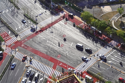 “過馬路不再卡殼,大膽放心往前走,這種路口對行人太友好了!”在附近銀行上班的王宇感慨道,路口“人車分流”,通行效率提升,行人也更加安全。