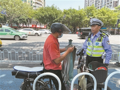 “騎乘電動自行車,一定要正確戴安全頭盔,下次要記住了?!睌?shù)名未佩戴頭盔的電動自行車駕駛?cè)吮粓?zhí)勤交警進行口頭教育。其中,一名男子拿出頭盔簡單戴上后便想離開,被眼尖的交警一把攔住。
