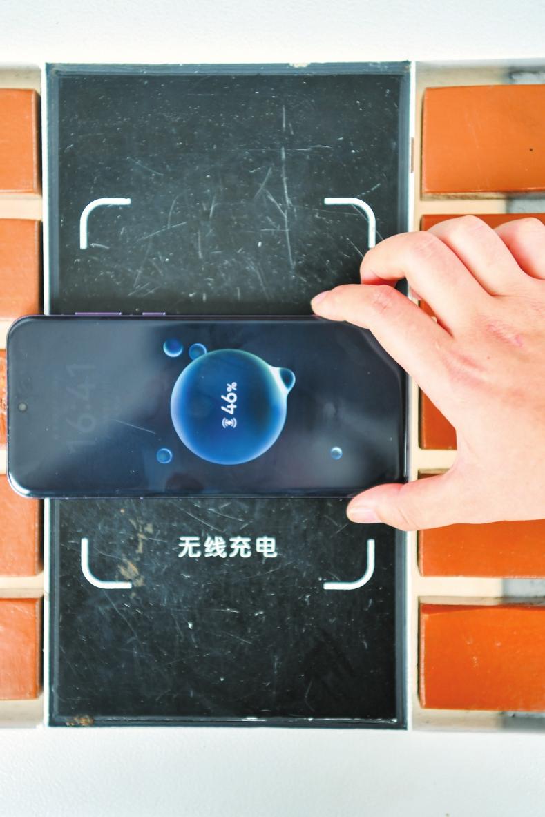 市民在智能公交站臺(tái),使用座椅旁的無線充電器為手機(jī)充電。記者 孫士杰 攝