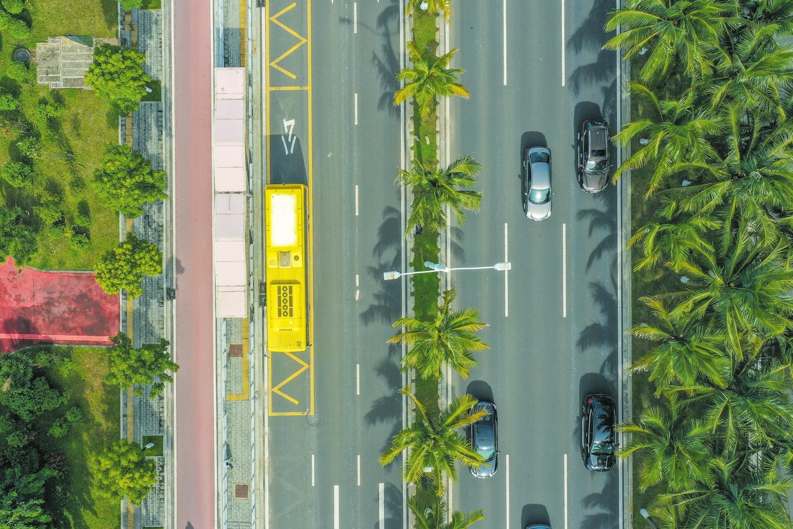 白駒大道沿線,造型獨(dú)特的公交站臺(tái)與路邊一字排開的椰樹相映成趣,彰顯??诘摹拔兜馈?。記者 孫士杰 攝