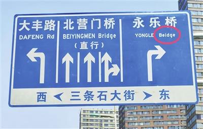 英文拼寫(xiě)和翻譯的問(wèn)題在天津市一些道路指示牌上也屢見(jiàn)不鮮。河?xùn)|區(qū)八緯路與北十五經(jīng)路交口,一塊地面立桿式道路指示牌上,“大直沽西路”的英文“west(西)”錯(cuò)誤標(biāo)為“east(東)”;紅橋區(qū)河北大街永樂(lè)橋橋下的指示牌,將“Bridge(橋)”錯(cuò)拼成“Beidge”;紅橋區(qū)西沽公園門(mén)口的一塊指示牌,將“丁字沽南大街輔路”英文翻譯成“Dingzigu South Auxlllary Rd”,誤拼的“Auxlllary”讓人難以理解。“我猜想,可能是要用‘Auxiliary(輔助的)’這個(gè)單詞。”河北工業(yè)大學(xué)的一位學(xué)生說(shuō)。