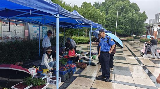 “阿姨,您在這兒流動擺攤既不安全也影響交通,不如去附近的楊梅疏導點看看?我先帶您過去?!?月10日上午,大碶街道綜合行政執(zhí)法隊隊員熱情地向一位梅農(nóng)阿姨介紹街道特設(shè)的楊梅自產(chǎn)自銷“好去處”。