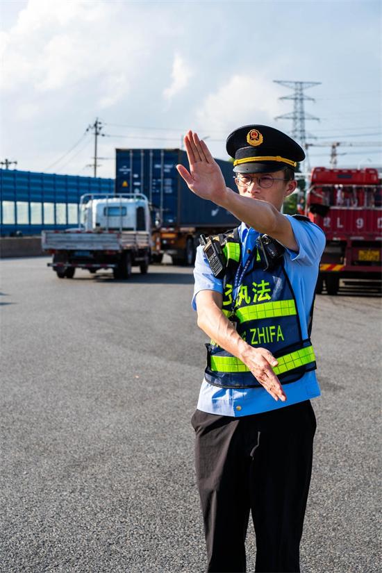 若遇上車流高峰,執(zhí)法隊(duì)員們便需鉚在灼熱的路面上:蹲守目標(biāo)、監(jiān)督稱重、緊盯卸貨環(huán)節(jié)。在烈日暴曬下,常常一站就是幾小時(shí)。汗水肆意流下,刺進(jìn)眼睛,也只能快速抬手抹一把。