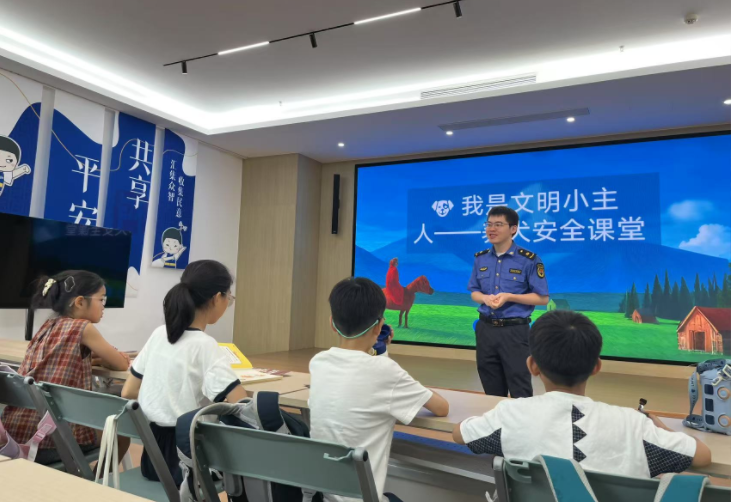 活動中,執(zhí)法人員許平波化身普法“螢火蟲”,借助動畫PPT《我是文明小主人——養(yǎng)犬安全課堂》吸引孩子們的注意力,初步了解文明養(yǎng)犬相關(guān)的法律知識。隨后,他結(jié)合真實(shí)案例,用互動問答的方式,詳細(xì)講解了城市禁養(yǎng)犬類型、犬鏈規(guī)范使用、排泄物及時(shí)清理等法規(guī)知識,特別強(qiáng)調(diào)“一犬一牌”“大型犬戴嘴套”“電梯主動避讓”等日常場景的行為準(zhǔn)則?,F(xiàn)場搶答環(huán)節(jié)熱烈,孩子們踴躍參與,在一問一答中進(jìn)一步筑牢了“依法養(yǎng)犬、責(zé)任養(yǎng)犬”理念。孩子們通過角色扮演、承諾簽名,逐漸從“聽懂”到“會做”,還主動爭當(dāng)“小小普法員”,表示要監(jiān)督家人文明養(yǎng)犬。