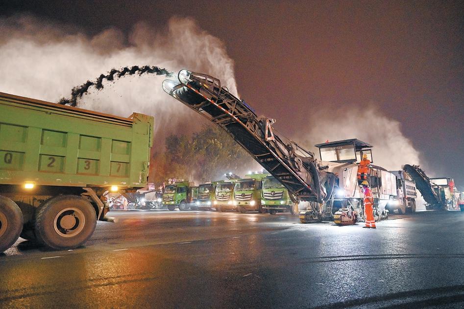 隨后,壯觀的一幕出現(xiàn)——在臨近長安街的東單、崇文門等大型路口,提前待命的大型渣土車、攤鋪車等發(fā)車,沿著指定路線,首尾相接地趕來,有序駛?cè)胧┕ざ巍R粫r(shí)間,長安街上機(jī)械轟鳴,熱浪蒸騰。隨著銑刨機(jī)車底的刀盤高速轉(zhuǎn)動(dòng),老化的道路面層被“鏟”去4厘米,再重新鋪上4厘米新型瀝青。路面最寬位置,8臺攤鋪機(jī)并肩作業(yè),它們身后還跟著十多臺壓路機(jī)。
