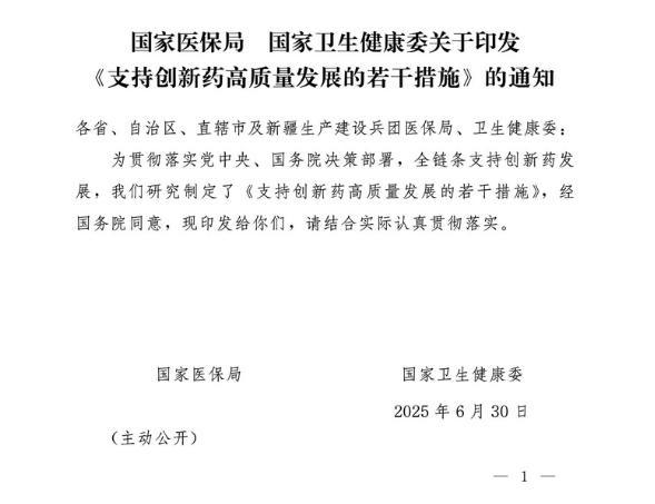 據(jù)國家醫(yī)保局網(wǎng)站消息,國家醫(yī)保局、國家衛(wèi)生健康委6月30日印發(fā)《支持創(chuàng)新藥高質(zhì)量發(fā)展的若干措施》。其中提到,加大創(chuàng)新藥研發(fā)支持力度,支持創(chuàng)新藥進入基本醫(yī)保藥品目錄和商業(yè)健康保險創(chuàng)新藥品目錄,支持創(chuàng)新藥臨床應(yīng)用,提高創(chuàng)新藥多元支付能力。