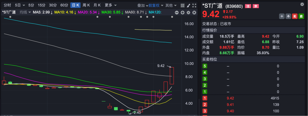 北交所公司*ST廣道(839680)股價(jià)仍在“狂飆”。