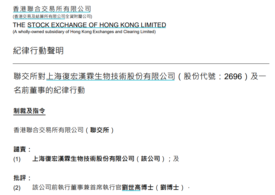 9月2日,復(fù)宏漢霖(2696.HK)公告了一份聯(lián)交所對公司及一名前董事的紀律行動聲明。文件顯示,復(fù)宏漢霖受到港交所譴責(zé),而公司前執(zhí)行董事兼CEO劉世高受到批評。港交所要求劉世高接受26小時有關(guān)監(jiān)管和法律議題以及上市規(guī)則合規(guī)事宜的培訓(xùn),才能再獲委任為任何已于或?qū)⒂诼?lián)交所上市的公司董事。