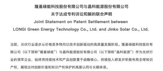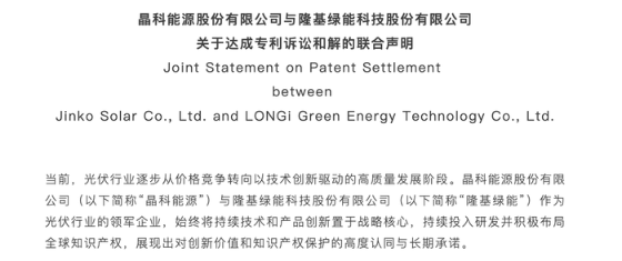 聲明以中英雙語呈現,稱隆基綠能與晶科能源聯(lián)合宣布,就雙方及雙方關聯(lián)公司在全球范圍內正在進行的相關專利主張和法律事項,達成和解協(xié)議。