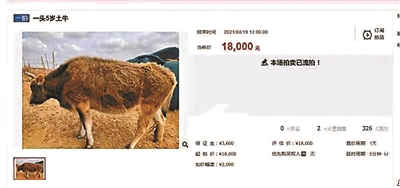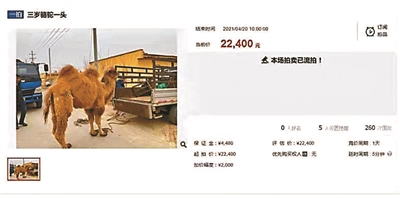 今年4月19日12時(shí),新疆維吾爾自治區(qū)木壘哈薩克自治縣人民法院在阿里拍賣(mài)平臺(tái)上對(duì)一頭3歲的駱駝和一頭5歲的土牛進(jìn)行拍賣(mài)。駱駝的起拍價(jià)格為22400元,土牛的起拍價(jià)格為18000元。截至2021年4月20日12時(shí),兩只活物標(biāo)的物最終流拍。