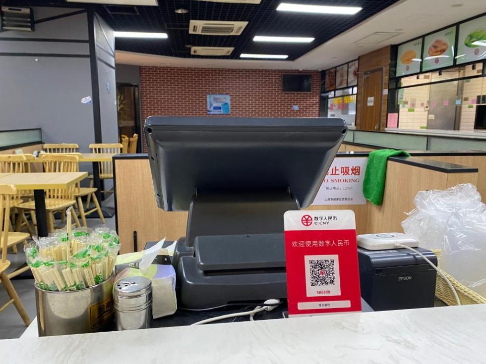 上海靜安區(qū)博風白領食堂的收銀臺上也擺放著一塊“數字人民幣”標牌,在這里吃飯的顧客可以便捷地使用這種新型支付方式。