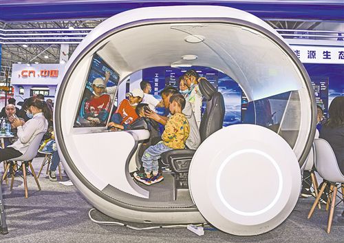 5月27日,孩子們?cè)凇皵?shù)博會(huì)”上通過虛擬電動(dòng)車體驗(yàn)綠色出行。