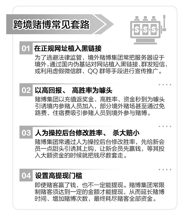 跨境賭博“逢賭必輸”,網(wǎng)絡(luò)賭博“陷阱重重”。近年來,跨境賭博形式多樣,套路層出不窮,無數(shù)民眾或主動(dòng)或被動(dòng)地身陷其中。今年3月1日起,《刑法修正案(十一)》正式施行,跨境賭博首次寫進(jìn)刑法,這意味著今后,國(guó)家將對(duì)此從嚴(yán)從重打擊。