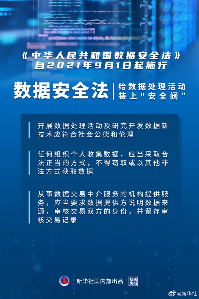 個人數(shù)據(jù)被不法分子竊取、買賣的問題咋破解?數(shù)據(jù)安全法自9月1日起施行,明確:①國家建立數(shù)據(jù)分類分級保護(hù)制度。②開展數(shù)據(jù)處理活動以及研究開發(fā)數(shù)據(jù)新技術(shù),應(yīng)當(dāng)有利于促進(jìn)經(jīng)濟(jì)社會發(fā)展,增進(jìn)人民福祉,符合社會公德和倫理。③國家建立健全數(shù)據(jù)交易管理制度,規(guī)范數(shù)據(jù)交易行為,培育數(shù)據(jù)交易市場。④不得竊取或以其他非法方式獲取數(shù)據(jù);數(shù)據(jù)交易中介服務(wù)機(jī)構(gòu)應(yīng)要求數(shù)據(jù)提供方說明數(shù)據(jù)來源、審核交易雙方身份。⑤國家機(jī)關(guān)應(yīng)建立健全數(shù)據(jù)安全管理制度,保障政務(wù)數(shù)據(jù)安全。愈加嚴(yán)密的法律體系,讓你我“觸網(wǎng)”無憂!(記者白陽,海報(bào)設(shè)計(jì)楊軼群)