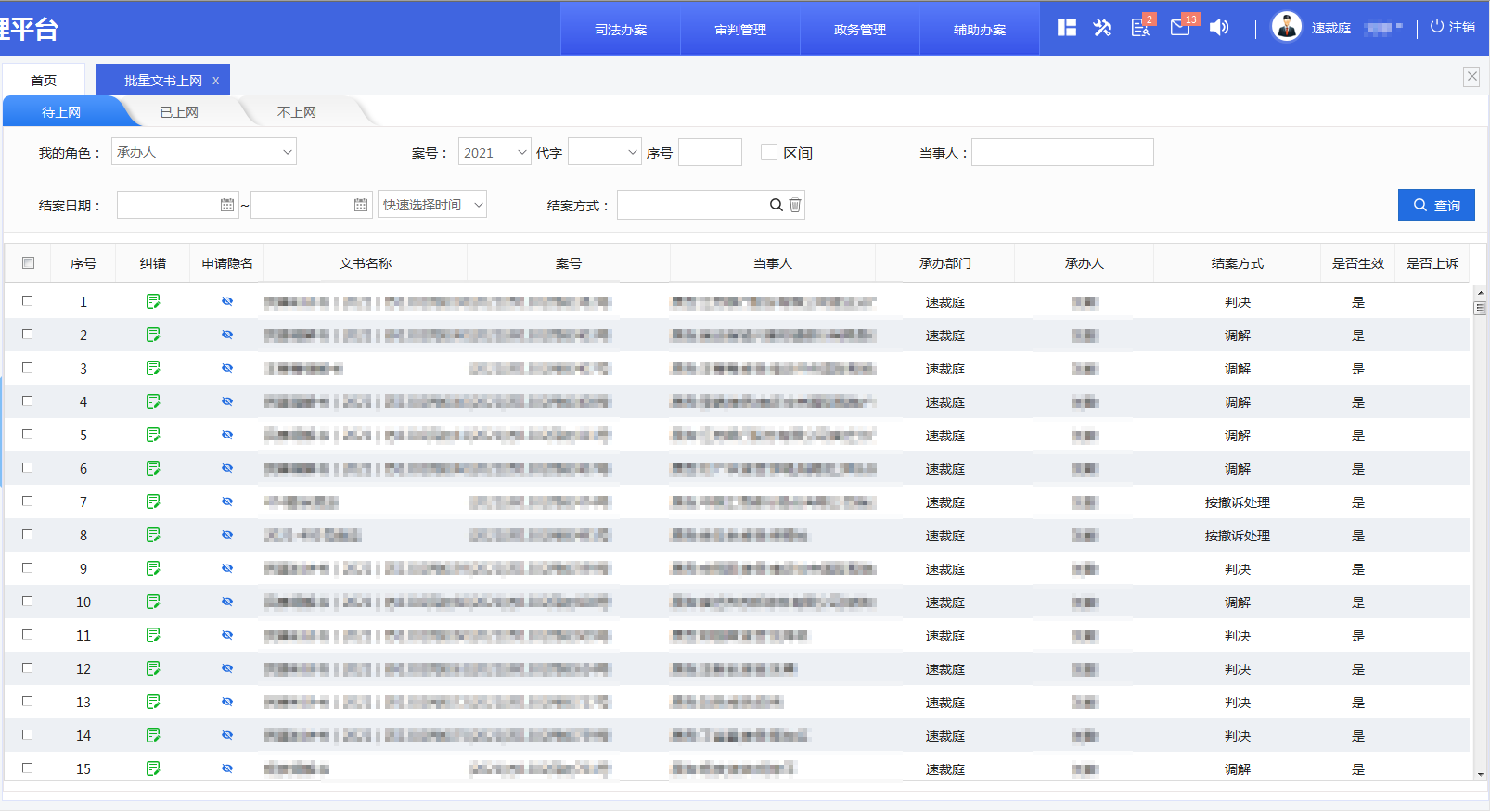 開發(fā)速裁快審系統(tǒng),支持批量案件流程事項的批量辦理,如批量審判組織設置、排期、扣除審限、報結(jié)案、移送上訴等,大大簡化了操作,提高工作效率,系統(tǒng)模塊化嵌入法綜系統(tǒng),用戶體驗好,操作簡便實用。為實現(xiàn)法官對簡案的快速辦理,將法官常用個案辦理功能放入“快捷辦理”列表中,并集成智能閱卷、文書制作、司法送達等智能卷宗功能,無須進入個案辦理頁面即可直接進行相關流程的辦理,簡化操作。