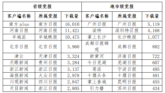 注:下載量為各黨報及其網站自建安卓客戶端在華為市場、小米應用商店、VIVO市場、OPPO市場、魅族市場、應用寶、百度手機助手、360手機助手、豌豆莢等9家安卓應用商店的下載量合計。