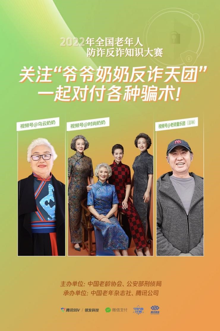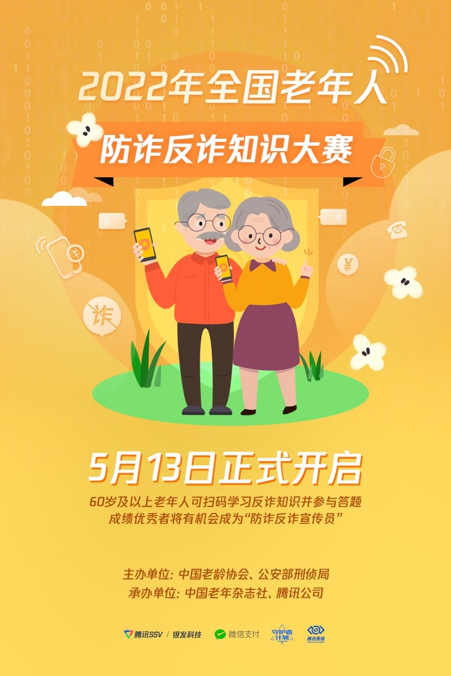 為提升老年群體防騙識(shí)騙能力,守護(hù)老年人的“錢袋子”, 5月13日,由中國(guó)老齡協(xié)會(huì)、公安部刑偵局主辦,中國(guó)老年雜志社、騰訊公司承辦的 “2022年全國(guó)老年人防詐反詐知識(shí)大賽”正式啟動(dòng)。作為“全民反詐在行動(dòng)”集中宣傳月的一項(xiàng)重要活動(dòng),大賽通過(guò)線上線下反詐知識(shí)科普、反詐知識(shí)競(jìng)答等多種方式為老年人普及反詐知識(shí)。