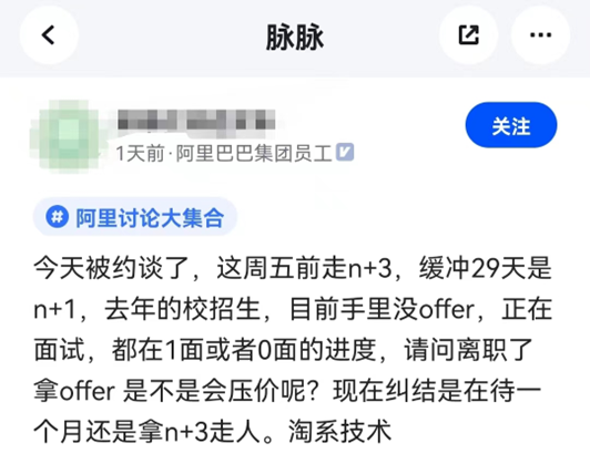 有阿里員工發(fā)文稱,“今天被約談了,這周五走N+3,緩沖29天是N+1,去年的校招生,目前手里沒(méi)offer,正在面試”。該員工還糾結(jié)是再待一個(gè)月還是拿n+3走人。還有員工發(fā)文證實(shí)阿里裁員N+3,并稱和之前流傳消息不同的是,最后期限提前到周三以及沒(méi)有次月社保。