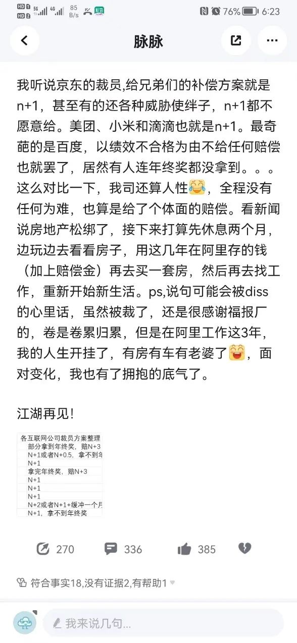 對(duì)于被裁,阿里人似乎并沒(méi)有外界想象中的“憤怒”。法治網(wǎng)研究院發(fā)現(xiàn),一名阿里員工在脈脈上頗為平靜地講述了被裁后的心路歷程。該員工稱自己剛談完賠償,人力給的補(bǔ)償方案是:N(經(jīng)濟(jì)補(bǔ)償金)+1(代通知金)+2(提前解約補(bǔ)助)。整體算下來(lái),工作三年的他可以拿到30萬(wàn)左右的賠償?!斑€是很感謝福報(bào)廠的,卷是卷累歸累,但是在阿里工作這三年,我的人生開(kāi)掛了,有房有車有老婆了,面對(duì)變化,我也有了擁抱的底氣了?!?/p>