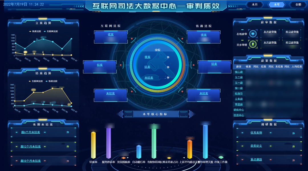 互聯(lián)網(wǎng)司法數(shù)智大腦構建了法院的數(shù)字畫像,實現(xiàn)實體法院與虛擬法院之間的虛實映射、實時交互和全生命周期管理。系統(tǒng)通過審判質(zhì)效、執(zhí)行質(zhì)效、當事人畫像等8個維度,運用時間、地域、主體、案由、標的、行業(yè)等動態(tài)模型對數(shù)據(jù)進行綜合分析應用,支持對案件、法官、當事人等信息進行最小顆粒度精準搜索,一屏總覽全院動態(tài),一鍵直達數(shù)據(jù)底層。