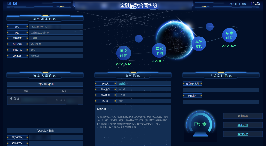 案件數(shù)字畫像整合全院的審判、執(zhí)行、人員、流程等數(shù)據(jù),對結(jié)案率、服判息訴率、改判發(fā)回瑕疵率等核心質(zhì)效指標進行監(jiān)控和預警,對在線庭審視頻實現(xiàn)一鍵點擊播放,對異步審理對話實現(xiàn)一鍵點擊瀏覽,對結(jié)案文書實現(xiàn)一鍵點擊查看,全面實現(xiàn)案件監(jiān)督管理全程網(wǎng)上運行、全程留痕,智能監(jiān)測審判過程和結(jié)果偏離態(tài)勢,推動審判監(jiān)督管理由盯人盯案、層層審批,向全院、全員、全過程的實時動態(tài)監(jiān)管轉(zhuǎn)變。
