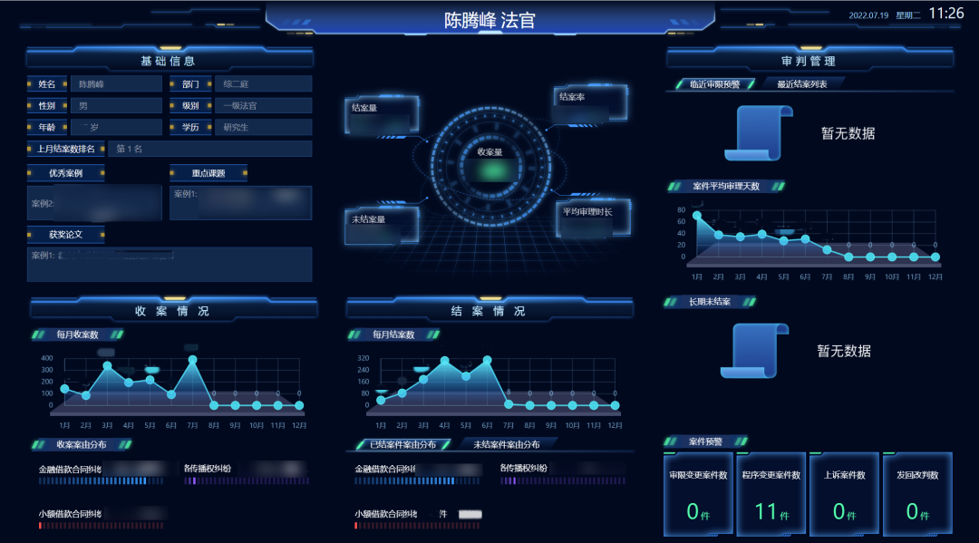 法官數(shù)字畫像對法官的數(shù)據(jù)進行歸集和細化,從個人信息、調(diào)研和案例、收結(jié)案情況、辦案質(zhì)效、案件類型、審限預警、辦案習慣、案件預警等維度對法官進行了完整畫像和能力分析?;诋嬒窈湍芰Φ姆治?,通過模型算法的構建,在分案中進行科學化精細化管理,對短板進行精準化補強,同時自動打造出“千人千面”的法官工作臺,幫助法官解決在辦案過程中遇到的各個難點、堵點和痛點。