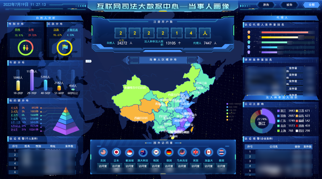 當事人數(shù)字畫像從身份信息、案件構成、訴訟能力、訴訟地位、行為特征等維度對當事人進行數(shù)字化重構,對當事人訴訟習慣和常見問題進行梳理和整合,對重點當事人進行識別和監(jiān)測,并將其反饋到業(yè)務系統(tǒng)的升級和優(yōu)化之中,切實以當事人需求為導向打造出“一看就懂、一用就會”的網(wǎng)上訴訟平臺。同時對涉訴較多的平臺、頭部企業(yè)等通過綜合案件主訴與被訴、案件類型、訴訟結(jié)果、訴請與抗辯內(nèi)容等全面分析其涉網(wǎng)糾紛情況和特征,幫助其完善合法合規(guī)、落實大政方針、打造良好營商環(huán)境,進一步強化互聯(lián)網(wǎng)空間治理。