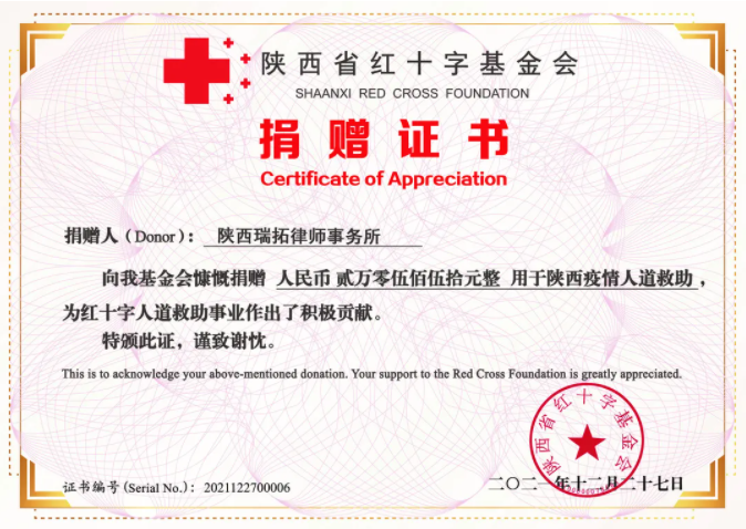 律所黨支部書記、主任付曉兵積極倡議支部黨員,討論通過向一線防疫工作捐款捐物的決議。全所人員共募捐資金20550元,第一時間向陜西省紅十字會進行防疫專項捐獻。