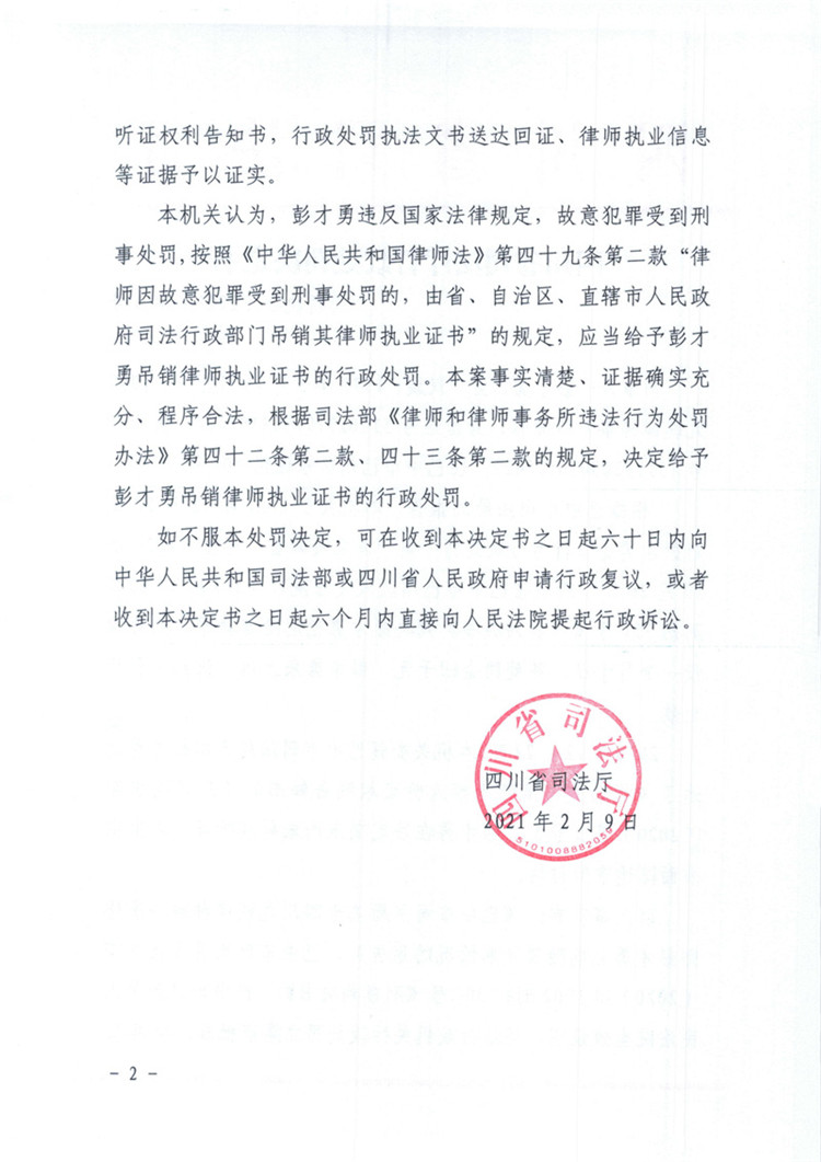 四川彭才勇因犯危險駕駛罪被處吊銷律師執(zhí)業(yè)證書