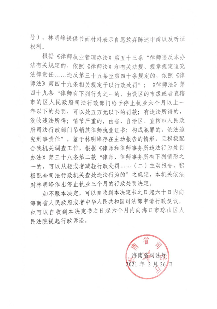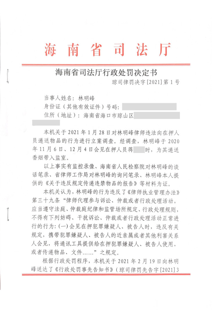 海南律師林明峰因違規(guī)會見被處停止執(zhí)業(yè)三個(gè)月