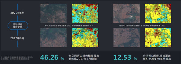 圖為孝義河河口、府河河口生態(tài)濕地綠色植被變化。