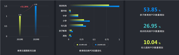 2020年雄安新區(qū)服務(wù)業(yè)相關(guān)需求出現(xiàn)了較大的增長。其中,維修、物流等相關(guān)搜索詞的用戶搜索量分別增長了78.74%和18.09%,而這兩類POI的數(shù)量相較于2019年同期也分別增長了28.49%和7.8%;親子教育類POI、培訓(xùn)機(jī)構(gòu)類POI和幼兒園POI增量分別為53.85%、26.95%和10.04%;醫(yī)療和汽車服務(wù)類POI數(shù)量的增長比例均達(dá)到30%;美食類POI數(shù)量同比增長24.7%,;購物類POI數(shù)量同比增長13.7%;