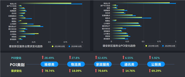 家政、通訊、公廁等POI數(shù)量則分別增長了32.43%、6.55%、5.92%。這些從側(cè)面反映出,雄安新區(qū)建設(shè)大軍的涌入,帶動(dòng)了當(dāng)?shù)叵M(fèi)需求的增長和消費(fèi)能力的提升。