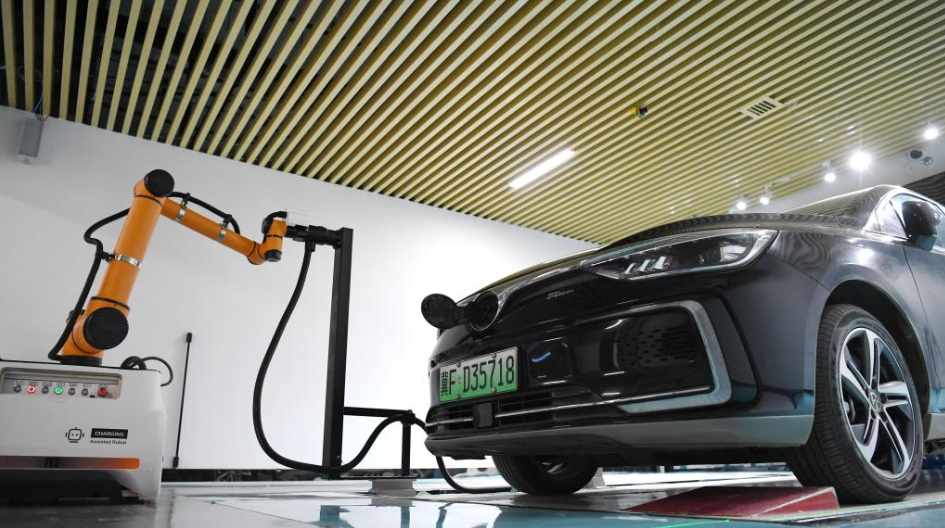在劇村站智慧充電區(qū),插拔槍機器人對一輛電動汽車進行充電。(新華社記者朱旭東 攝)