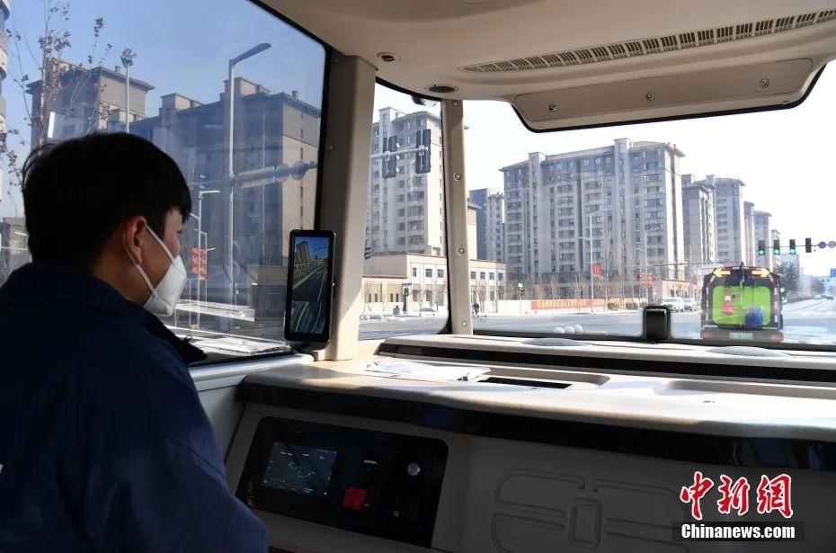 智能網(wǎng)聯(lián)巴士901線測(cè)試車(chē)輛正在通過(guò)紅綠燈。中新社記者韓冰 攝