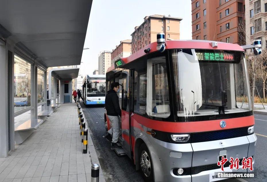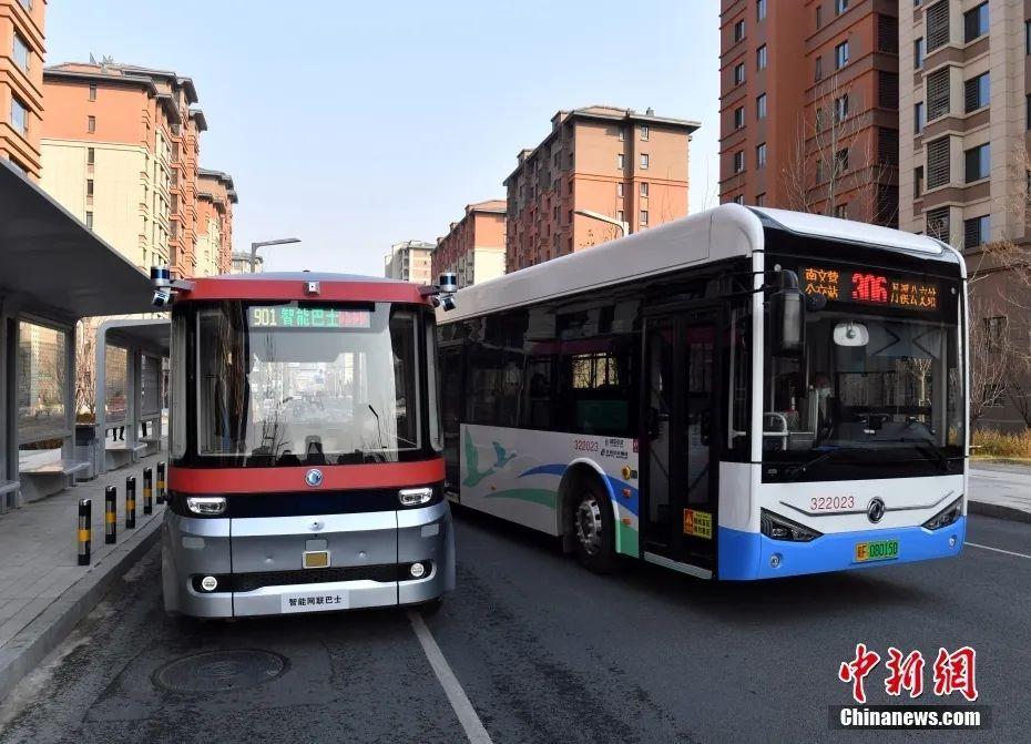 智能網(wǎng)聯(lián)巴士901線測(cè)試車(chē)輛準(zhǔn)備發(fā)車(chē)。中新社記者韓冰 攝