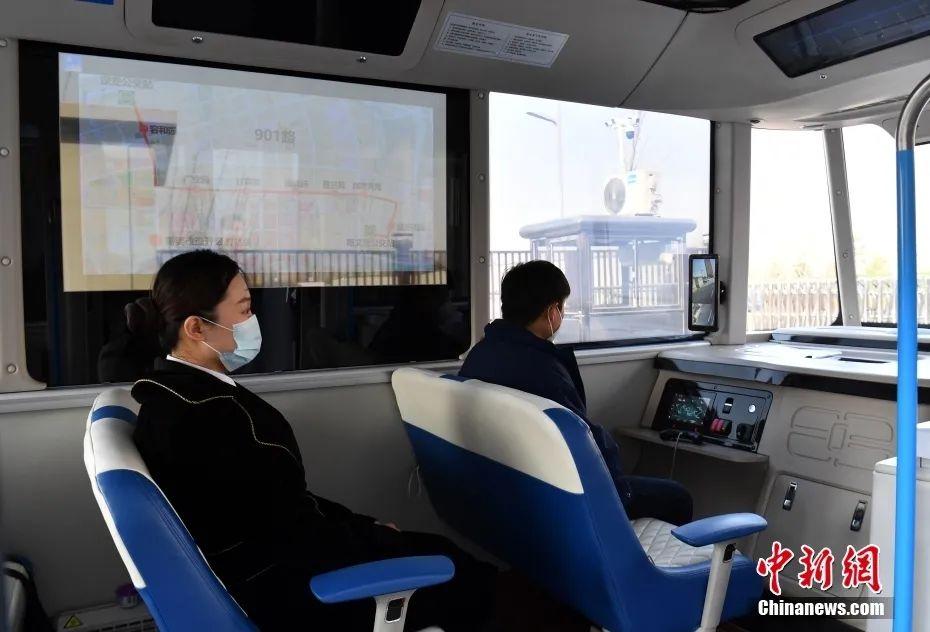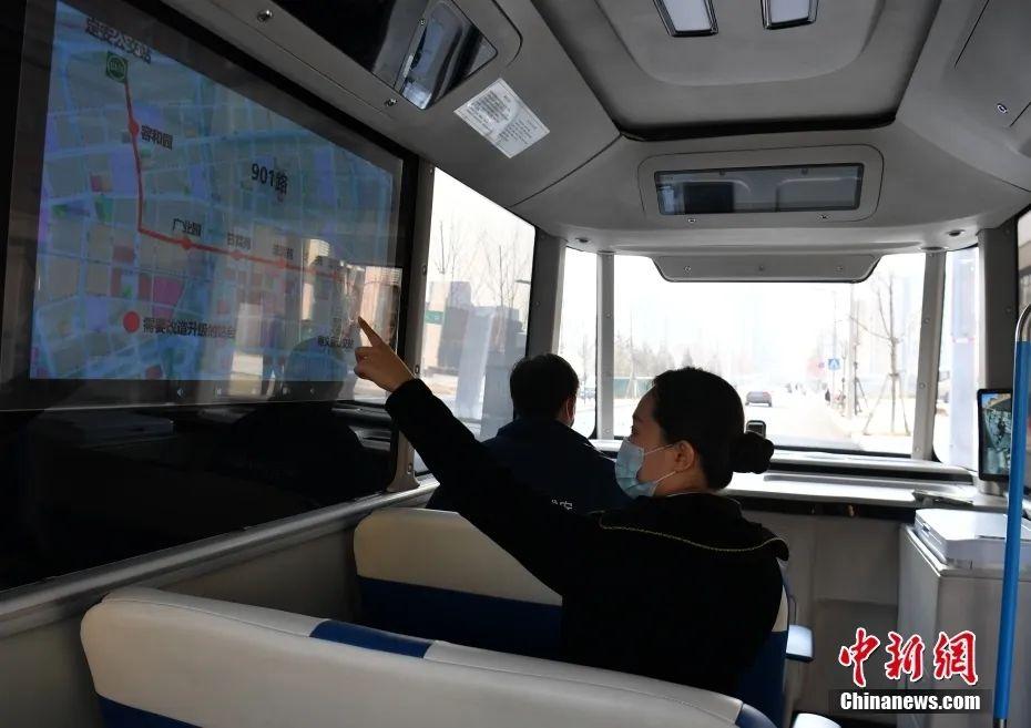 車(chē)輛可自主識(shí)別紅綠燈、道路提示牌和車(chē)道標(biāo)線等,做出跟車(chē)、超車(chē)、停車(chē)等動(dòng)作。圖為智能網(wǎng)聯(lián)巴士901線測(cè)試車(chē)輛??抗徽九_(tái)。中新社記者韓冰 攝