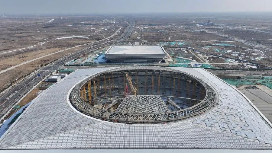 雄安體育中心建設現(xiàn)場(2月7日攝,無人機照片)。新華社記者牟宇 攝