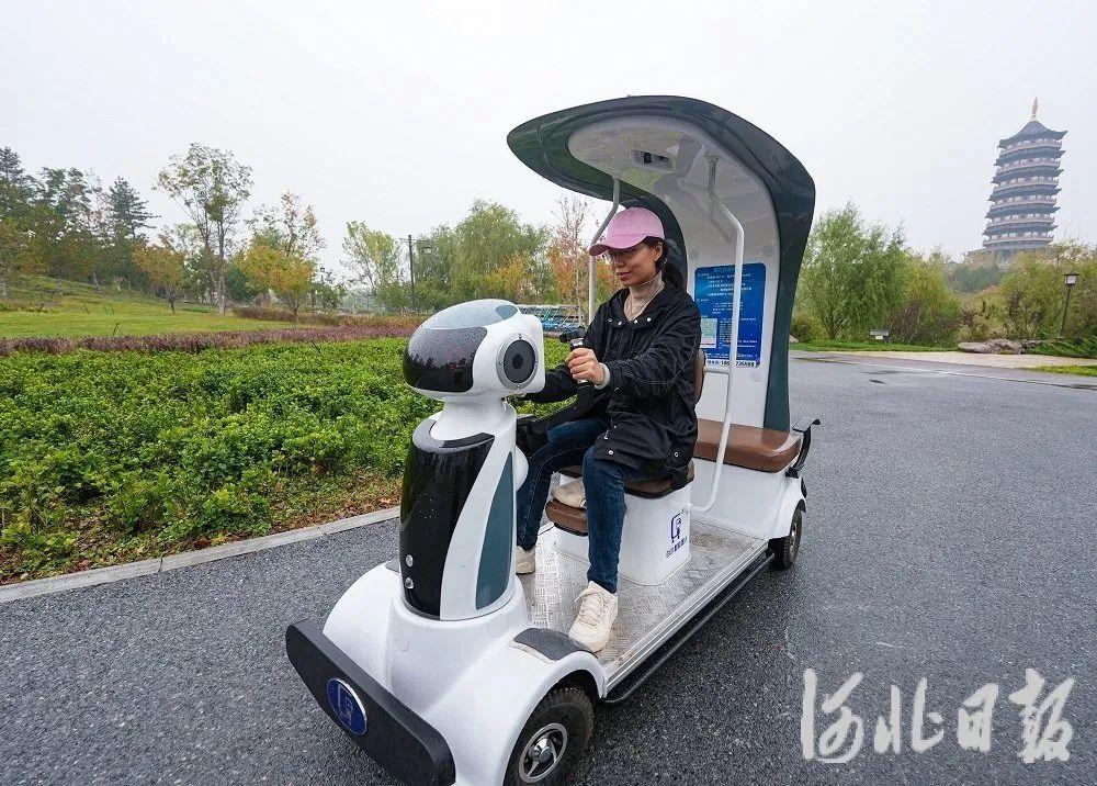 近日,在雄安新區(qū)悅?cè)莨珗@,游客正在操控“白小默”游覽公園。河北日?qǐng)?bào)記者李暢攝
