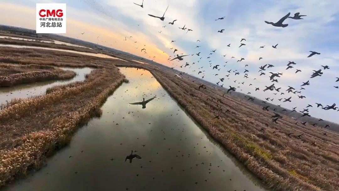 初冬時(shí)節(jié),在雄安新區(qū)白洋淀的孝義河口濕地,上萬只的雁鴨類候鳥在此棲息覓食,鳳頭鸊鷉不斷潛水捉魚,積攢往南遷徙的體力,旁邊的綠頭鴨則在水面嬉戲歇腳,傍晚時(shí)分,隨著陣陣鳴叫聲,萬鳥齊飛,天空中鳥浪翻滾,不斷變換著形態(tài),為集體遷徙南下度過寒冬做著最后的準(zhǔn)備。