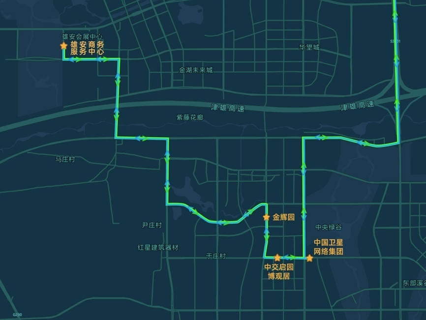 雄安新區(qū)設置4個上下客站點,從雄安商服中心站始發(fā),途經博觀居站、金輝園站、中國星網站。