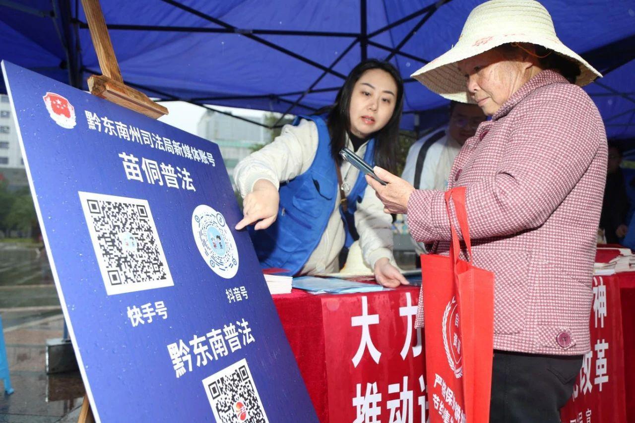 12月4日,法治宣傳志愿者在貴州省黔東南苗族侗族自治州凱里市萬博廣場(chǎng)引導(dǎo)群眾掃碼學(xué)法。(鄒光學(xué) 攝)