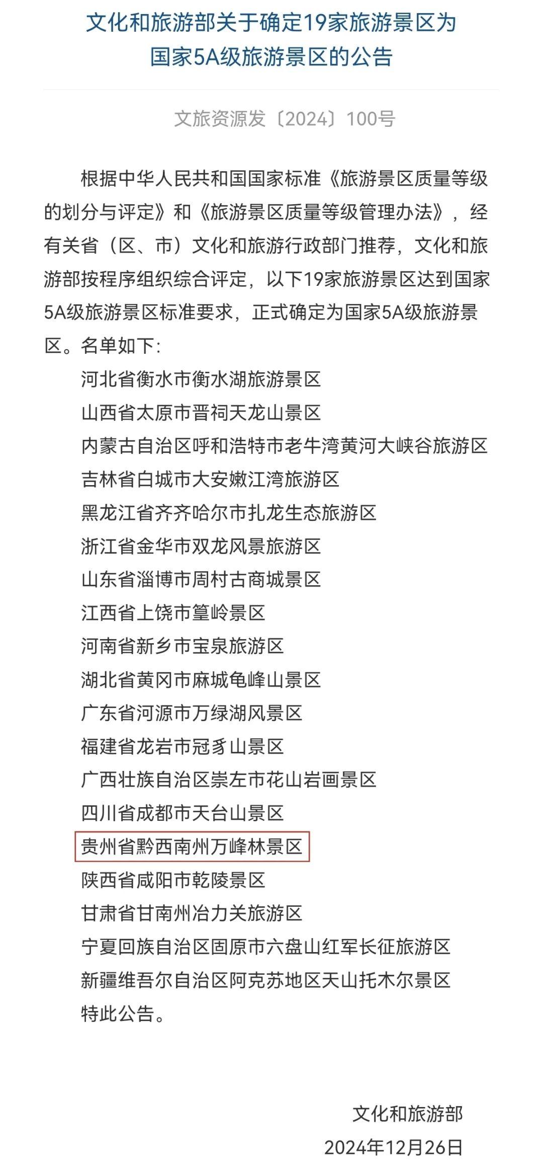近日,文化和旅游部網站發(fā)布公告,確定19家旅游景區(qū)為國家5A級旅游景區(qū),其中,貴州省黔西南州萬峰林景區(qū)成功入選,成為貴州省第10個國家5A級旅游景區(qū)。