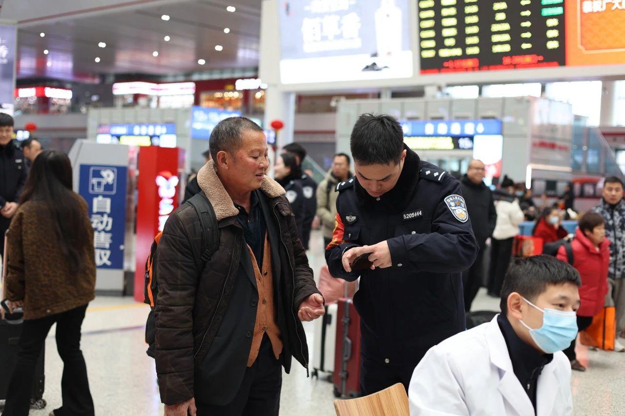 “注意腳下,請往這邊走。”“您好,您的檢票口在前面右轉(zhuǎn)?!薄拔襾韼湍嵝欣畎桑 痹谫F陽北站候車室內(nèi),戴著紅袖套的志愿者民警們?yōu)槁每吞峁┳稍冎敢徇\行李、電子取票等溫馨服務(wù),用這一抹紅色點綴春運,用實際行動溫暖寒冬。