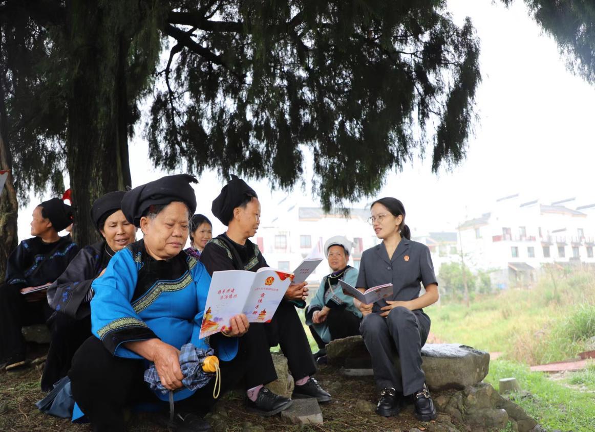 作為一名水族法官,蒙勝翠還結(jié)合本地水族群眾講傳統(tǒng)、重習(xí)俗,蒙勝翠就借助“水書先生”“繡娘”的智慧與經(jīng)驗,將水家文化習(xí)俗與現(xiàn)代法治精神相融合,通過開展“水語法庭”“布依語法庭”巡回審判,聯(lián)合“水書先生”等鄉(xiāng)賢參與矛盾糾紛調(diào)處,成立“繡娘調(diào)解室”、組建“水鄉(xiāng)巾幗調(diào)解隊伍”等,開展多方聯(lián)動,實現(xiàn)情理法融合,促進矛盾糾紛實質(zhì)化解。