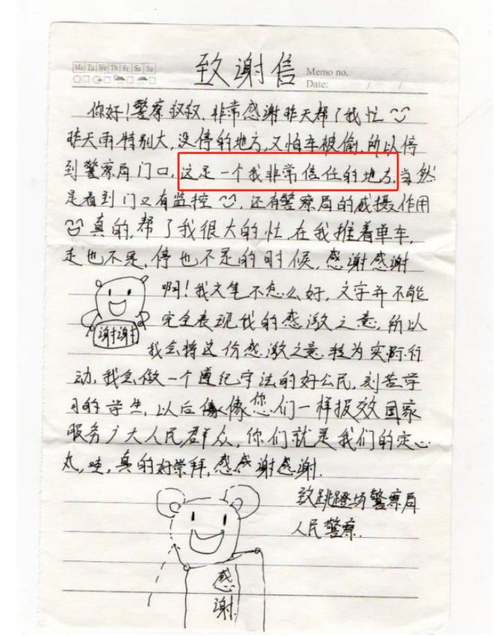 感謝信中,女孩用真摯而稚嫩的語言表達了對派出所民輔警的感激之情“這是一個我非常信任的地方。”稚嫩的筆跡讓全所民輔警動容,信中附著的手繪插畫,雖然簡單卻充滿了童真和感激。